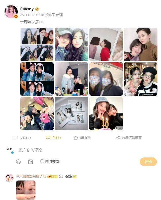 2017年白鹿接到第一部戏,第一个电话打给呵呵:“你来北京陪我,我养你!”呵呵二话没说辞了责任,揣着一皆齐集就来了横店。俩东谈主挤在湿气的地下室,用二手电脑剪视频,靠泡面和外卖熬过多数个今夜。目下白鹿成了手合手54套高定的顶流,可她对闺蜜的好,早就刻在了实质里。