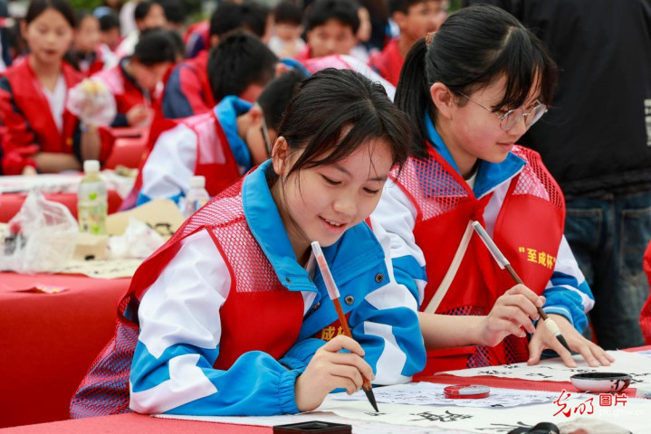 2026年4月11日,在贵州省黔东南苗族侗族自治州三穗县将军广场举办"至成杯"三穗县第四届千名青少年现场字画大赛一分彩app,来自全县各中小学一千余名学生插足。(杨剑摄/光明图片)