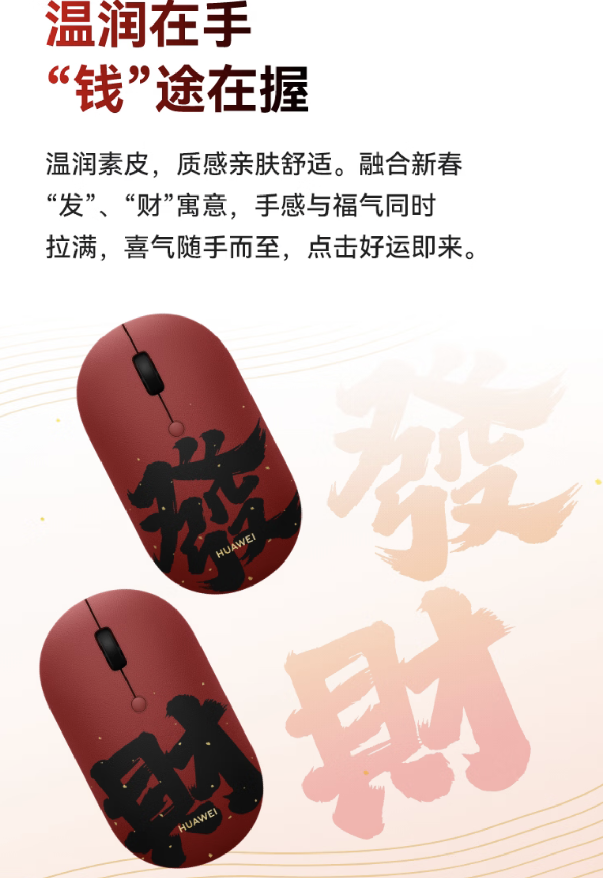 IT之家 1 月 28 日讯息,华为晓示旗下无线鼠标 Slim 素皮版已至今天 10:08 在京东开售,该家具继承红色素皮外不雅,提供“发”“财”两字版块,订价均为 169 元。