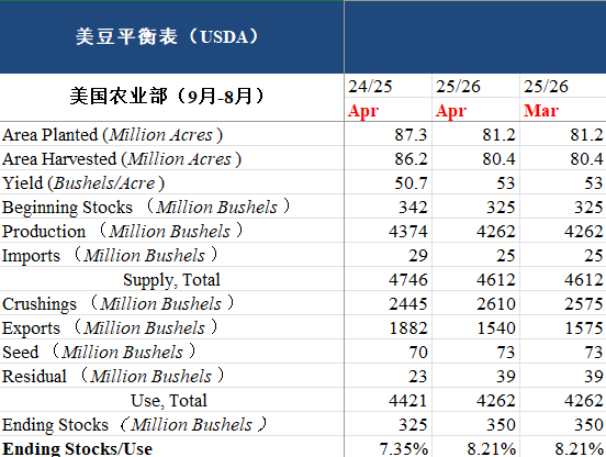 USDA公布四月供需数据,数据偏中性。本次呈文中,好意思豆25/26年度均衡表中,压榨由25.75亿蒲上调至26.1亿蒲,出口由15.75亿蒲下调至15.4亿蒲,此消彼长之后结转库存看守3.5亿蒲不变。南好意思方面,巴西24/25年度大豆产量由1.715亿吨上调至1.725亿吨,25/26年度期初库存上调至3769万吨,出口上调至1.15亿吨,结转库存由3791万吨下调至3769万吨。阿根廷25/26年度结转下调至2272万吨。本次呈文数据影响偏中性,对价钱的影响有限,好意思豆受好意思豆粕及好意思豆油的撑握企稳。
