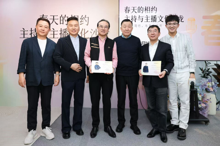 嘉宾合影迷恋。左起为邱晓彤、亚宁、骁宗、何海明、赵健、张泽群。中中语化促进会主理与主播服务委员会供图
