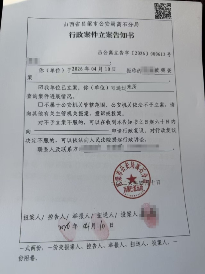 4月12日,记者就此事屡次致电并短信联结吕梁中院相干发达东谈主,松手发稿暂未获回答。同日,记者了解到,此事经王女士报案后,吕梁市公安局离石分局西属巴派出所已于4月10日就王女士报称被猥亵一案进行行政立案。