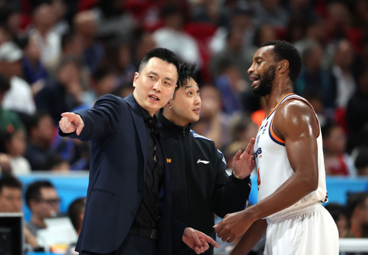 4月12日,上海队主解释卢伟(左)在比赛中疏导球员弗格(右)。新华社记者张晨摄
