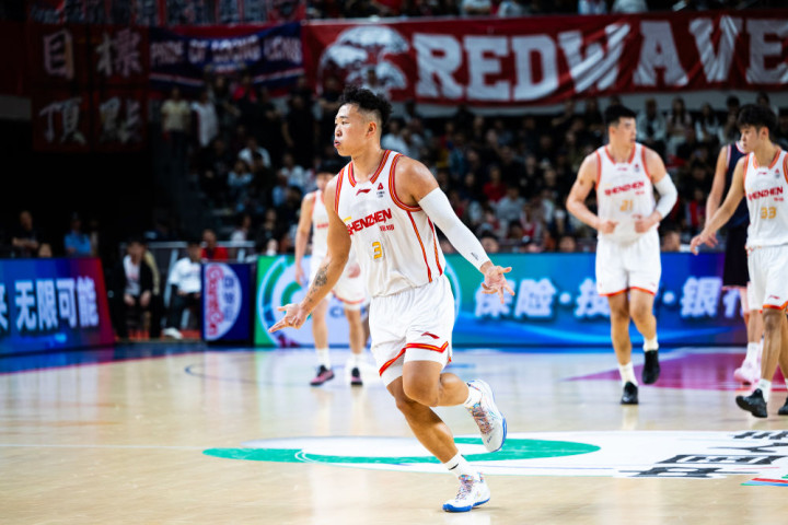 4月24日,深圳队球员贺希宁(左)在掷核心纽三分球后庆祝。新华社发(华野摄)