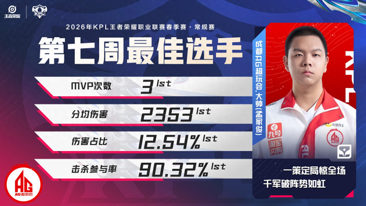 2026年KPL春季赛第七周,因为有卡位赛和第三轮的赛程,因此,网友们看得特别爽!精彩的比赛结束之后,第七周的最好威望也出炉了!AG超玩会时隔七周,终于有选手再次拿下周MVP!同期,周最好威望中,AG也有两东谈主入选!