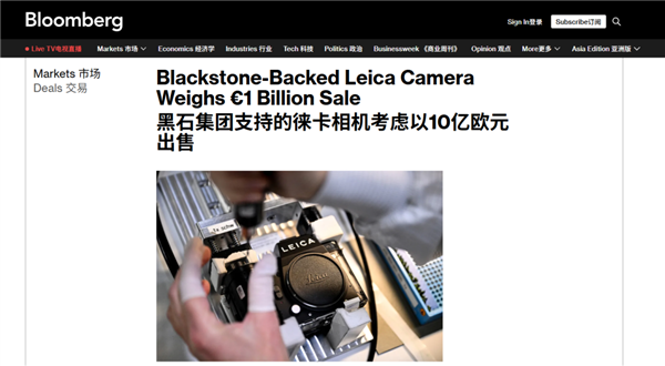 据彭博社最新爆料:徕卡相机两大股东正皆集寻求出售公司控股权,其中好意思国私募巨头黑石拟清仓所持全部45%股份,持有55%控股权的考夫曼家眷也同步激动股权出售,这次来回中徕卡举座估值约10亿欧元,折合东谈主民币约82.46亿。