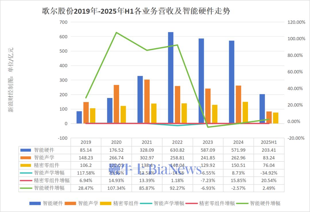 进入2023年,歌尔智能硬件业务的营收运行出现了光显下滑,由上一年的同比增长92.27%,变为下落6.93%,随后2024年下落2.57%,至2025年上半年,仅保握2.49%隐微增长。