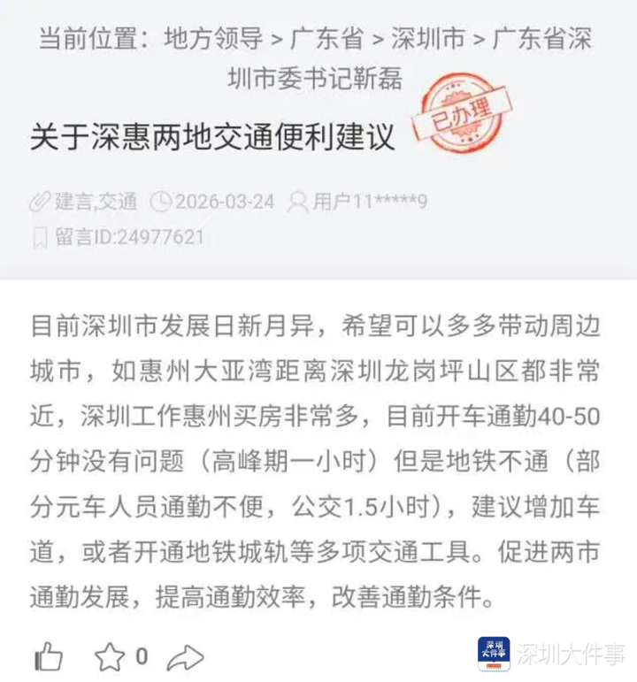 为此,有深圳网友在东说念主民网诱导留言板发问,建议通过通畅跨市地铁、城际轨说念等花样,完善深惠两地轨说念交通衔尾,进步深惠两市通勤恶果。